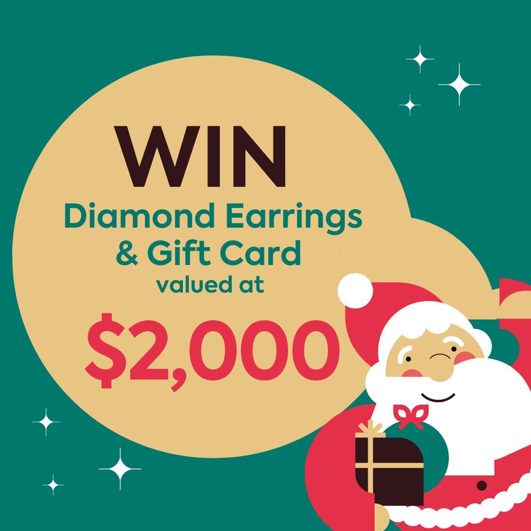 Simply spend $100* in centre at participating specialty stores and you could be in with a chance of winning a pair of 9ct yellow gold .50ct Diamond Earrings (RRP $1,500) and a $500 Centre Gift Card this Christmas.